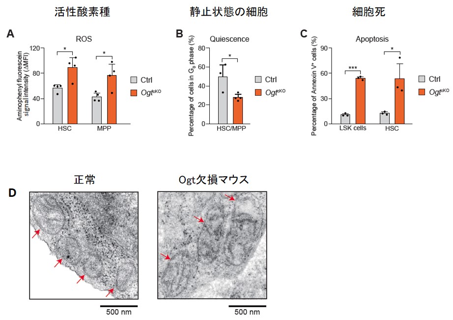 続いてOGTを欠失した造血幹細胞で何が起きているかを調べたところ、細胞を障害する活性酸素種*5が増加し、静止状態が失われ、アポトーシス*6による細胞死が亢進していました(図2A-C)。さらに細胞のエネルギー産生に重要なミトコンドリア*7が異常な形態を示しており、機能的に不良なミトコンドリアが蓄積していることも明らかとなりました(図2D)。
