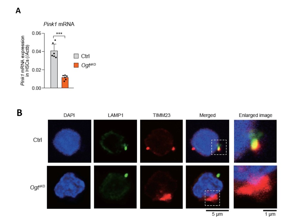 (A) Pink1の発現量 (B)マイトファジーの状態:OGT欠損造血幹細胞(OgtcKO)では、正常細胞(Ctrl)で見られるようなマイトファジーを示す黄色い点が見られない。