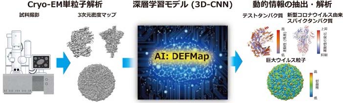 cryo-EMの単粒子解析での撮影試料は生体高分子溶液を瞬間的に冷凍して準備することから、得られる単粒子画像群には、溶液中での動的なゆらぎを反映したさまざまな構造のスナップショットが含まれます。そのため、これらの画像を収集・解析することで最終的に得られるcryo-EM データ(3次元密度マップ)には、暗に運動性に関わる情報が含まれている(隠れている)と考えられます。そこで共同研究グループは、このcryo-EMデータに含まれる「隠れた」運動性情報を上手く抜き出すためのAI「Dynamics Extraction From cryo-EM Map;DEFMap」を開発しました(図1)。
