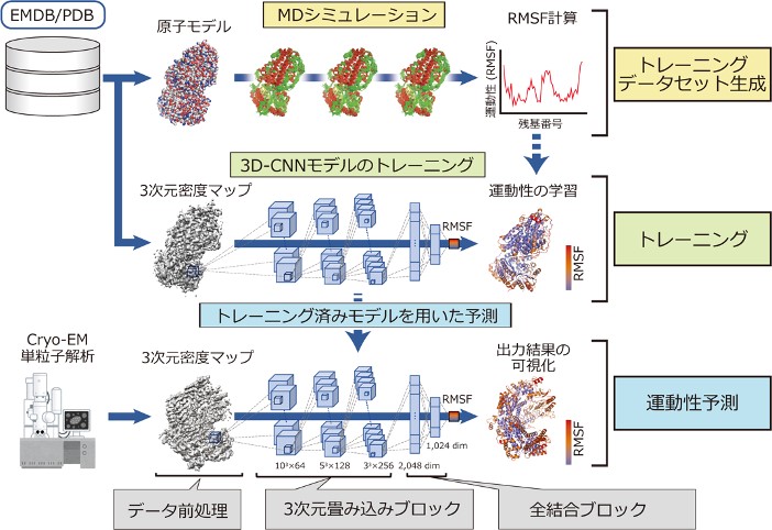 理化学研究所(理研)科技ハブ産連本部医科学イノベーションハブ推進プログラム(MIH)医薬プロセス最適化プラットフォーム推進グループの松本篤幸研究員、奥野恭史グループディレクター(MIH副プログラムディレクター、京都大学大学院医学研究科教授)、京都大学大学院医学研究科の荒木望嗣准教授、横浜市立大学大学院生命医科学研究科の寺山慧准教授、大阪大学蛋白質研究所蛋白質構造生物学研究部門の加藤貴之教授らの共同研究グループ※は、AI技術の一種である深層学習[1]と分子動力学(MD)計算[2]を組み合わせることで、クライオ電子顕微鏡(cryo-EM)[3]で計測される立体構造データのみから、タンパク質の運動性情報(柔らかさ)を直接抽出する新たな手法の開発に成功しました。