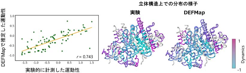 【図3 実験で計測した運動性とDEFMapで推定した運動性との比較】 図2のTest 3タンパク質について、公開されていたペプチドフラグメントレベルの動的情報を検証に用いた。左に、実験とDEFMapの運動性の相関図を示す。緑で各運動性の値を、オレンジでそれらの回帰直線を示す。また、右にそれぞれの運動性の立体構造上の分布をカラーバーに従って色分けした。紫が高い運動性、青が低い運動性を持つ領域であることを示す。実験と DEFMapの運動性が良く一致していることが分かる。