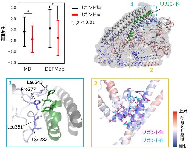【図4 リガンド結合に伴う運動性変化の検出】 上段:左は、リガンド結合界面に位置する全アミノ酸残基の運動性の平均値(丸)と標準偏差(バー)を示すグラフ。MD計算、DEFMapともにリガンド結合に伴い、運動性の有意な低下が観察された。右は、タンパク質立体構造上で運動性の変化の分布を右下のカラーバーに従って示している。このうち緑色で示す部分がリガンドである。この可視化により、リガンド結合領域の残基で青色(運動性抑制)傾向が強いことが確認できる。 下段:全体図(上段右)の点線領域の拡大図。左は、リガンドとの重要な相互作用を担う四つの残基をスティックモデルで示している。右は、リガンド結合部位とは離れた場所で、運動性が抑制された残基側鎖をスティックモデルで示しており、立体構造モデルはリガンドの有無にかかわらず、ほぼ同一であった。
