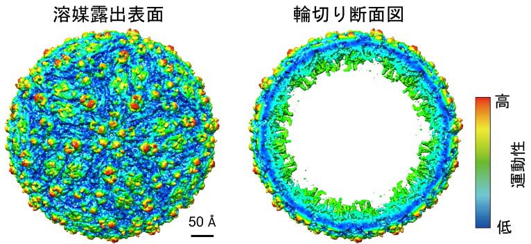 【図5 超巨大ウイルス粒子(EMDB ID: EMD-8139)の運動性推定】 推定した運動性の分布を右のカラーバーに従って色分けしている。左には溶媒に露出した表面を、右には輪切りにした断面を示している。またスケールバーは50Åの長さを示している。例えば、図2のタンパク質Test 1の長軸の長さが100Å程度なので、今回予測に用いたウイルス粒子が非常に大きいことが分かる。