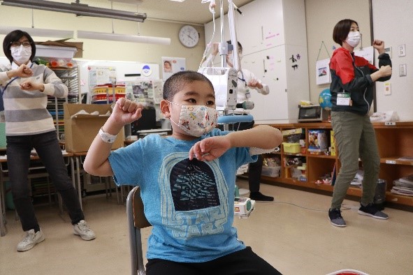 ラガーマンと一緒に体操をトライする活動及び明日の目標(トライ)を共有し、応援し讃えあう交流活動を通し、入院中のこどもたち同士の交流や仲間づくりを支援する取り組みです。ラガーマンとの交流を通して、一人で頑張る治療生活ではなく、仲間とともに乗り越える治療生活を日本全国の小児医療現場に実現することを目指しています。