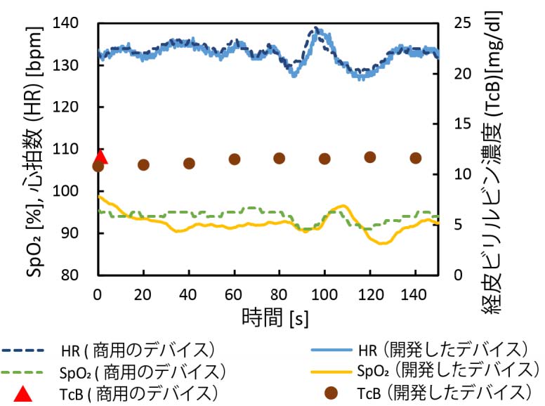 図2 開発したデバイスを用いて計測した心拍数, SpO2, 経皮ビリルビン濃度