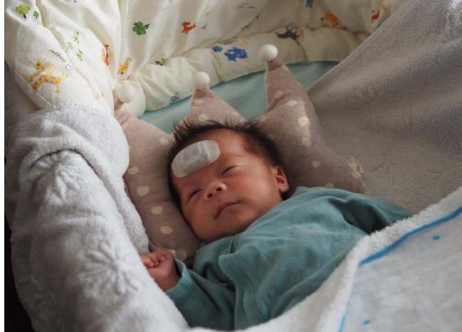 新生児は出生により胎内から体外へ環境が変化することで、臓器をはじめとした体内環境が非常に不安定です。そのため、経時的なバイタルサインの計測が必要不可欠となります。新生児において特に重要な指標の一つが経皮ビリルビン値です。経皮ビリルビン値が高くなると黄疸が発症します。新生児黄疸は新生児の6割~8割で発症し、重症な場合は脳機能障害等の重篤な後遺症につながります。黄疸を発症しやすい黄色人種の世界的な進出とともにこのような経皮ビリルビン値計測に関する需要は世界的に高まっています。また経皮ビリルビン値と他のバイタルサインの手軽かつ経時的な計測方法の確立は、新生児のQOL(Quality of Life)の改善だけではなく、在宅医療への高い需要に応える技術となります。本研究では、シリコーンゴムを主材とした材料を新生児とデバイスのインターフェースに用い、光学設計を最適化することによって、デバイス装着の高密着性を実現しつつ高効率で新生児に対して負荷が少ないウェアラブル型の経皮ビリルビン値・SpO2・脈拍計測デバイスを実現し(図1)、臨床でその有効性を実証しました(図2)。額から計測したバイタルサインを(図3)、Bluetoothを介してPC及びスマートデバイスで同時かつ経時的に確認できるようになりました。経時的計測の実現により経皮ビリルビン値の急激な変化を捉えることができ、さらにはビリルビン値が高い新生児の一般的な治療法の一つである光療法中の経皮ビリルビン値の計測も可能となり、これまでにない簡便かつ小型な新生児用ウェアラブル型スマートデバイスを実現しました。