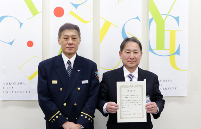 当日は、公立大学法人横浜市立大学を代表し、下澤明久事務局長が出席し、伊藤署長から感謝状を受け取りました。