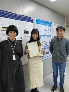 この度、優秀発表賞を頂くことができ、光栄に思っております。研究を進めるうえで苦労したところもありましたが、日頃からご指導してくださる辻先生をはじめ、いつもフォローしてくださる井藤さん、研究室の皆様にも心から感謝いたします。今後もより一層、研究に励んでいきたいと思っています。