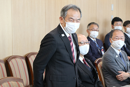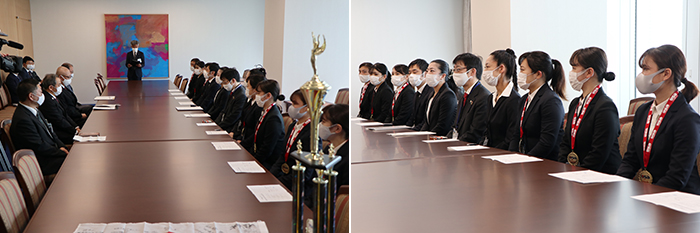 林副市長からは、「今回の準優勝は、横浜市や横浜市民に勇気と希望を与えてくれた。本当におめでとうございます」と準優勝を称えるコメントをいただきました。また、林副市長は、YCUの所在する横浜市金沢区の区長を務められたことに触れ、「横浜市立大学は、今でもとても身近に感じています。まるで親戚の子どもたちが準優勝したような気持ちで、とてもうれしい」と述べられ、緊張していた選手たちの表情も和みました。