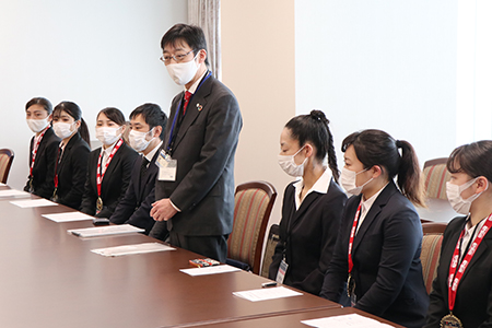YCUからは中條祐介副学長があいさつを行い、「コロナ禍において制約が多く、満足にチームでの練習や演技ができない中でも、シーガルズは、しっかりと感染対策を行いながらひたむきに練習に励んでいる模範的な学生団体」と紹介するとともに、「今回の渡航費用は、学生たち自身で寄付を募り、多くの方々に協力いただきながら用意しました。目標に向かって主体的に行動するYCUの学生の成長を実感しています」と述べました。