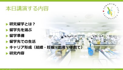 セミナー開催にあったて、グローバル推進部門長 中島先生に峯岸先生をご紹介いただきました。続いてご講演では、最初の留学(イギリスLeeds大学)とご家族で渡航された二度目の留学(シンガポールDuke-NUS)の準備や現地での生活について、また医師留学の主なパターンの他、「経験を早くから積む」、「自分のアピールポイント(研究)を確立してから挑む」等、自分の目的に合わせて留学のタイミングを検討することも必要であることなどをお話いただきました。また、ご自身の研究内容や、現地で広げられた人脈が現在の研究にとても役立っていること等、学生や若手医師が将来のキャリアを考える上でとても参考になるお話でした。