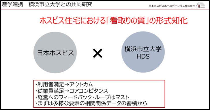 日本ホスピスホールディングスでは、ガン末期やALS等神経難病の方の看取りを支援する「ホスピス住宅」を全国19か所で運営しています。ホスピス住宅にとって利用者の人生最後の時を満足できるものにすることは、非常に重要かつスキルの必要な仕事です。その「看取りの質」を高めることは、利用者の満足度、従業員満足度、そして離職率といった経営数値の推移に相関関係があり、それが質の高い看取りを実現すると考えています。そこで、経営学、医学の学部はもとより、大学院データサイエンス研究科に日本で初となるヘルスデータサイエンス専攻を開設し、2つの附属病院を有する横浜市立大学と、多くの看取りの症例を蓄積する日本ホスピスホールディングスとが連携・研究することで、世界でも課題になっている「看取りの質」の向上を目指した組織改善手法の開発に取り組みます。
