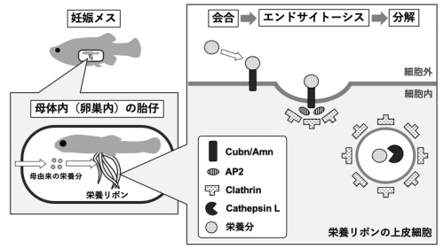 Cubilin/Amnionless受容体が関与するエンドサイトーシスは、一部の脊椎動物の消化管で栄養分吸収に寄与することが報告されています。ここで言う“一部の脊椎動物”とは無胃魚*6や授乳期の哺乳類を指し、消化機能の未熟さをエンドサイトーシスによる細胞内の分解機構で補っていると考えられます。グーデア科胎生魚において、胎仔が成長する卵巣内腔に消化機能があるとは考えにくく、栄養リボンが細胞内の分解機能を持つことは妥当です。以上から本研究グループでは、構造的・機能的な共通点から、栄養リボンの一部が消化管に由来すると考えました。栄養リボンがグーデア科の胎仔に特有の構造物であることから、これはユニークな胎生機構の成り立ちに関わる仮説となります。