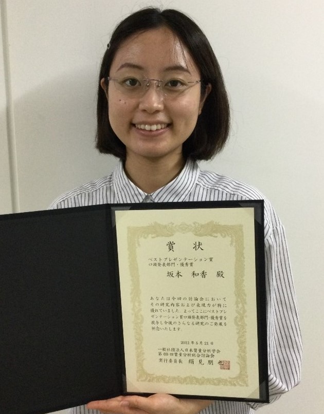 大学院生命医科学研究科博士前期課程1年の坂本和香さん(指導教員:明石知子教授)は、2021年5月19日(水)~21日(金)にオンラインで開催された日本質量分析学会 第69回質量分析総合討論会において口頭発表を行い、ベストプレゼンテーション賞 口頭発表部門・優秀賞を受賞しました。 たった一つのヒト赤血球をサンプリングして、ヘモグロビンを壊さずに質量分析で観測することに成功し、その実験手法について詳しく報告しました。