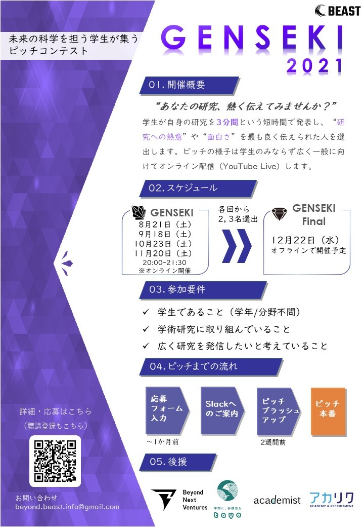 YCU大学院生が運営に携わる 学生コミュニティBEASTが、学術研究を行っている学生を対象に、研究を語るピッチコンテスト「GENSEKI」を開催します。