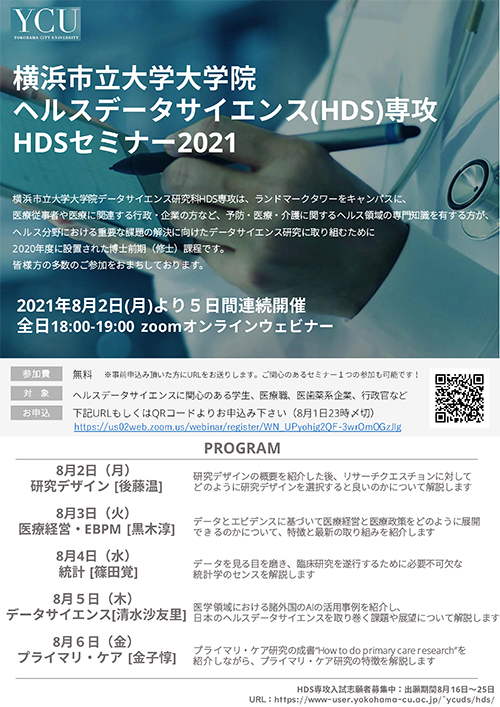 横浜市立大学大学院のヘルスデータサイエンス(HDS)専攻が、HDSセミナー2021を2021年8月2日(月)より5日間連続開催します!