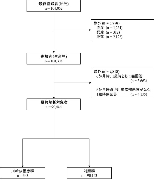図:対象者選別のフローチャート エコチル調査の対象となった妊婦から生まれた104,062人の子どものうち、流産、死産、協力取りやめ等による対象とならなかったものを除き、90,486人が本調査の対象となりました。このうち、1歳までに343人が川崎病を発症しました。