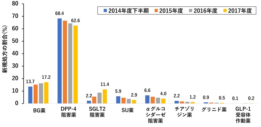 今回の全国規模の調査によって、①本邦の2型糖尿病患者に対して最初に投与される糖尿病薬は欧米と大きく異なりDPP-4阻害薬が最も多いこと、②BG薬で治療を開始した患者の総医療費が最も安いこと、③薬剤選択に一定の地域間差や施設間差があること、等が初めて明らかになりました。