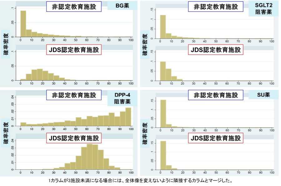 各薬剤の選択に最も強く影響した因子は年齢で、高齢なほどBG薬、SGLT2阻害薬の処方割合は低く、DPP4阻害薬およびSU薬の処方割合が高いことが示されました(図2)。施設によって処方実態が異なるかを検討したところ(図3)、大きく異なった薬剤はBG薬とDPP-4阻害薬で、BG薬は日本糖尿病学会(JDS)認定教育施設にて15-20%をピークとした分布(最初に投与された糖尿病薬のうち15-20%がBG薬であった施設が最も多かったことを意味します)であるのに対し、非認定教育施設では0-5%を急峻なピークとした分布を示し(最初に投与された糖尿病薬のうち0-5%がBG薬であった施設が多数を占めたことを意味します)、特に38.2%の非認定教育施設でBG薬の処方がありませんでした。一方、DPP-4阻害薬はJDS認定教育施設にて60-65%をピークとした分布であるのに対し、非認定教育施設では95-100%をピークとした0%から100%にわたる緩やかな分布を示しました(非認定教育施設では最初に投与する糖尿病薬としてほぼすべての患者に対してDPP-4阻害薬を選択する施設が最も多いものの、DPP-4阻害薬を選択しない施設も一定数存在しました)。一方、SGLT2阻害薬およびSU薬についてはJDS認定施設も非認定施設も同様の処方実態を示しました。