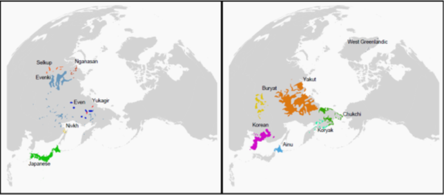 【図1】北東アジアとその周辺地域にまたがる11の言語族に相当する14言語の分布。日本語族(日本語)、アイヌ語族(北海道アイヌ語)、朝鮮語族(韓国語)、ツングース語族(エヴェン語・エヴェンキ語)、チュクト・カムチャツカ語族(チュクチ語・コリヤーク語)、テュルク語族(ヤクート語)、モンゴル語族(ブリヤート語)、エスキモー・アリュート語族(西グリーンランドイヌイット語)、フィン・ウラル語族(セルクプ語、ガナサン語)、ニブフ語族(ニブフ語)、ユカギール語族(ユカギール語)