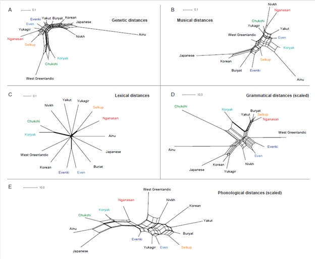 研究グループは、言語(文法、音韻、語彙)、音楽、ゲノムの5要素を主成分分析や主座標分析を用いて、同じデータ形式に落とし込みました。そして5つの要素の類似性の可視化を行いました【図2】。