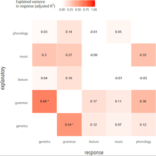 【図3】5つの要素〔言語(文法、音韻、語彙)、音楽、ゲノム〕を冗長性解析で分析した。*はp≦0.05を示す。