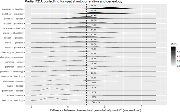 【図4】空間的自己相関と言語間のバイアスを除去したpartial RDA解析の結果。縦軸は2つの因子間の関係(説明変数->応答変数)。横軸は、本研究で得られた相関関係が偶然(ランダムサンプリング)で説明する場合からどのくらいかけ離れているかをZスコアという指標で示しており、1000回繰り返した結果を分布(カーブ)で示している。分布が黒線(y=0)近くにある場合は偶然と区別が付かないが、右側に行けば行くほど、偶然では説明しにくいことを意味する。また1000回の繰り返し実験を行った場合、そのZスコアが1より高い値になった割合を%で示している。更にその差をカルバックライブラー情報量(KLD)という指標でグレースケールで示している。例えば一行目のgrammar -> geneticsは96.7%の再現性をもって文法間の類似性で遺伝的距離を説明できることを意味しており、genetics -> grammarは遺伝的距離で文法間の類似性を説明した場合に90.0%の再現性があったことを示している。