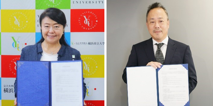(左)公立大学法人横浜市立大学 理事長 小山内 いづ美 (右) 株式会社データビークル 代表取締役 CEO 油野 達也