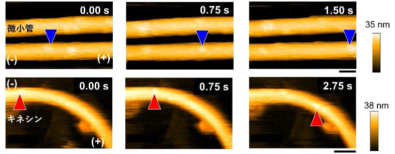 研究グループは,微小管のメカノセンサーとしての機能をモータータンパク質であるキネシンの運動性を高解像度の観察システムである高速原子間力顕微鏡*4を用いて分子レベルで解明しました。