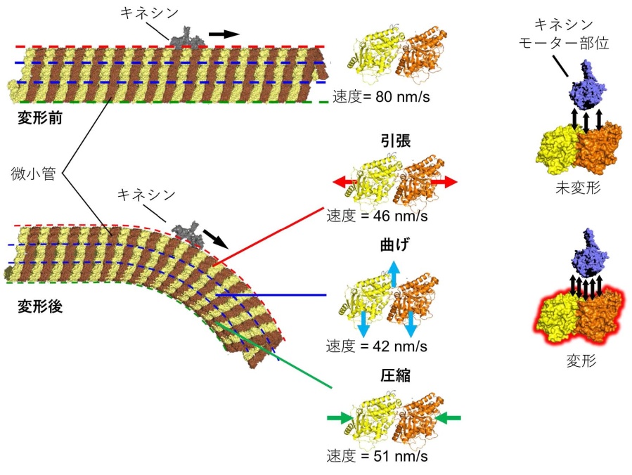 上記の手法により研究グループは,微小管は圧縮,引っ張り,曲げなど力学的ストレスに応じて構造変化することで,微小管に沿って運動するモータータンパク質キネシンの運動速度を変化させることを明らかにしました。運動速度の変化は,変形の度合いに依存することも明らかにしました。
