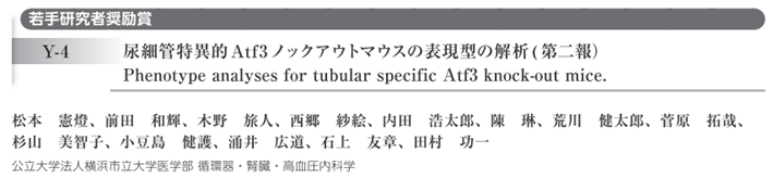 第43回日本高血圧学会(沖縄)において、横浜市立大学医学部医学科4年生の前田和輝君、松本憲燈君が、遺伝子の活性化や不活化に重要な働きをする核内転写因子として知られているAtf3を、腎臓の尿細管といわれる部位で機能を喪失したマウス(尿細管特異的Atf3ノックアウトマウス)を使った研究で、『食塩感受性(Salt Sensitivity)』の分子レベルでの機序に迫る成果を報告して、若手研究者奨励賞を受賞しました。
