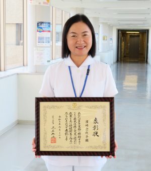 濱崎 登代子 看護部長は、看護部門における組織運営や地域貢献等の業績、功労が認められ受賞者に選出されました。