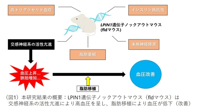 横浜市立大学附属市民総合医療センター 腎臓・高血圧内科 藤原亮助教(血液浄化療法部)、小澤萌枝医師(同大大学院医学研究科)、平和伸仁准教授、角田剛一朗博士(同大大学院医学研究科:研究当時)らの研究グループは、LPIN1遺伝子の全身ノックアウトマウスであるfld(fatty liver dystrophy)マウスを用いた評価と解析により、血圧が上昇することを明らかにし、そのメカニズムとして交感神経活性の亢進が関与していることを証明しました(図1)。今後、本態性高血圧症の新しい治療薬の開発につながる可能性があります。