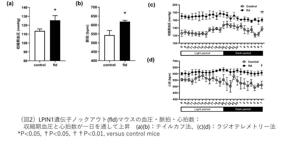 本グループでは,2007年にマイクロサテライトを用いたゲノムワイド関連解析によりLPIN1遺伝子が本態性高血圧症の候補遺伝子の一つであること発見しました。今回の研究では、LPIN1遺伝子の全身ノックアウトマウスであるfld(fatty liver dystrophy)マウスを用いて、血圧の評価とメカニズムの解析を行いました。テイルカフ法*4およびラジオテレメトリー法*5を用いた血圧測定では収縮期血圧と心拍数が24時間持続して上昇しており、日内変動が消失しました(図2)。