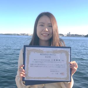 小林瑠那さん、このたびは発表賞の受賞、おめでとうございます。 これまで微生物の細胞を扱ったウェットな研究が多かったですが、今回はメタゲノム解析を用いて微生物のエネルギー・炭素代謝を考察するというドライな研究に取り組んでもらいました。発表の原稿やスライドの作成を頑張った甲斐があって、限られた発表時間の中で注目菌株の特徴(近縁種との共通点とユニークな点)を過不足なく解りやすく伝えることが出来たことがとても良かったと思います。事前に関連するゲノム研究の論文を読み込み、代謝に関する知識を深めたことで、質疑応答でも有意義な議論を行えていたと思います。修了まで残り期間は短いですが、最後まで充実した研究生活を送って下さい。