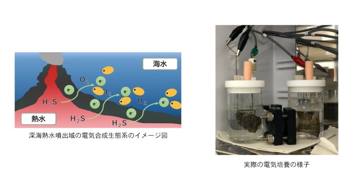 近年、深海熱水噴出孔の周辺では「発電現象」が起きていることが明らかとなり、その電気を食べて生育する「電気合成微生物」の存在が示唆されています。そこで本研究では、深海熱水噴出域の岩石を使い、電気だけをエサとした電気培養を行いました。 結果、チオミクロラブダス(Thiomicrorhabdus)属に含まれる細菌が集積し、この菌が電気によって増殖していることが確認されました。