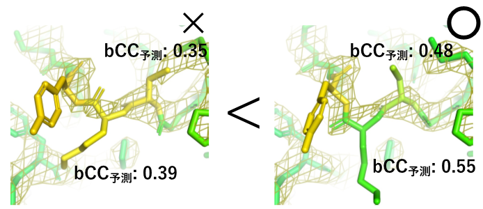 QAEmapは、評価したいタンパク質構造の電子密度マップとそれに対応する座標を入力するとbCCを予測でき、より正しい構造を選ぶことができます(図1)。さらに、この方法はリガンド結合の評価に適用できる可能性があることから、低解像度で困難な化合物結合様式の判断にも適用できると考えられます。