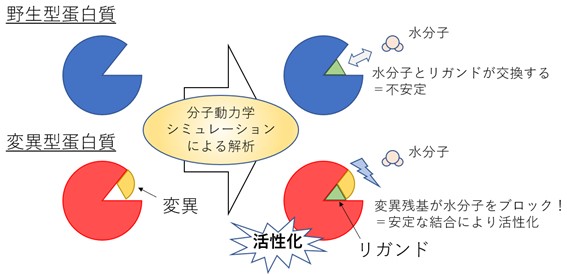 本研究では分子動力学シミュレーションを用いてこの現象を解明することを試みました。分子動力学シミュレーションの結果、変異したロイシン残基は”栓“のような役割を果たし、周囲に存在する水分子から硬質コルチコイド受容体に結合しているリガンドを遮蔽し、結合安定化させる働きがあることが分かりました。今後はリガンドが異なっても同じような現象がみられるか、蛋白質の立体構造への影響に出るかなど確認したいと考えています。