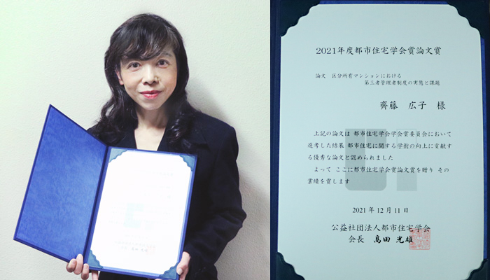 齊藤教授の論文『区分所有マンションにおける第三者管理者制度の実態と課題』(機関誌『都市住宅学 111』号に掲載)が、都市住宅に関する学術の向上に貢献するとして高く評価されました。