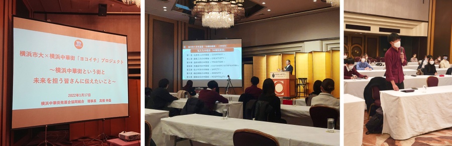 学生たちの意見にバイアスがかからないように、あえて座談会のあとに実施しました。中華街発展会側の意見(現在の課題や今後の展望)をお話しいただくことで、両方の側面から物事を考えることが出来ます。学生たちが設営に携わり、対面、オンラインのハイブリットで実施しました。中華街の成り立ちから、横浜の一大観光地への発展の歩みと今後のビジョンなど、高橋理事長の熱意にあふれるお話に対し、会場、オンライン双方から沢山の質問がでました。知識を得ることで、学生たちの興味関心が一層深まっていく様子です。