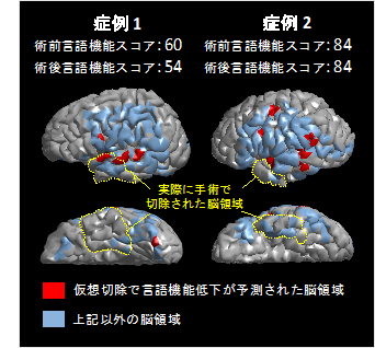 (図1)仮想切除で予測された言語機能領域と実際の手術で脳切除領域との空間的関係を示した図: 症例1では、仮想切除で言語機能低下が予測された脳領域(赤領域)が実際の切除領域に含まれており、術後に言語機能スコア (CELF-4 core language score) の低下を認めていました(左図)。 一方、症例2では切除領域には術後言語機能低下が予測された脳領域は含まれておらず、術後も言語機能スコアは保たれていました(右図)。