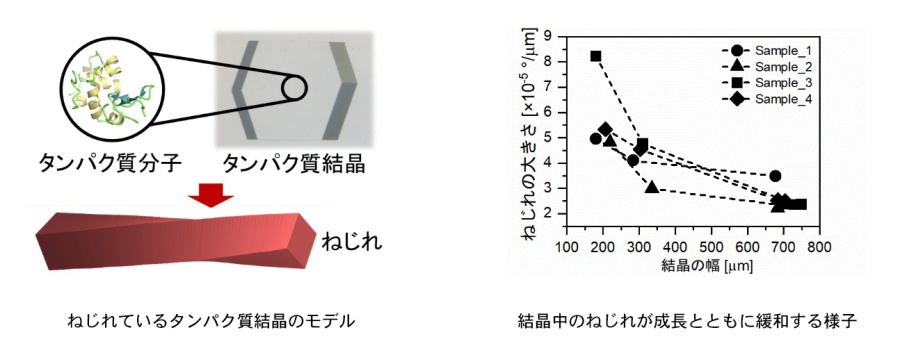 また、本研究ではタンパク質結晶の微小なねじれが結晶成長とともに均一に緩和する(ねじれが小さくなる)ことも発見しました。得られたデータの解析により、結晶中のねじれが小さいほど結晶の品質が高いということも分かっています。