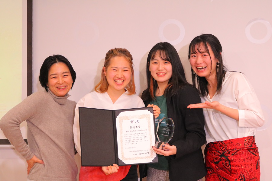 横浜市立大学チームを率いた芦澤准教授(国際商学部)と優勝したStockBaseの関さんを囲むHomiracleの2人(米ケ田さんと川口さん)