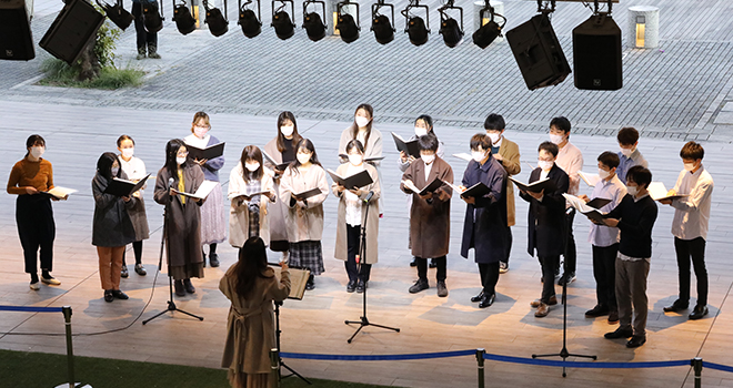 2021年11月28日、雲ひとつない晴天の中、「1DAY School Fes in YOKOHAMA BAYSIDE」が三井アウトレットパーク 横浜ベイサイド内「くじらの大屋根広場」において行われました。このイベントは本学学生が中心となって企画立案を行いました。YCUから4つのサークルや団体が、それぞれのパフォーマンスや歌、演奏を披露しました。
