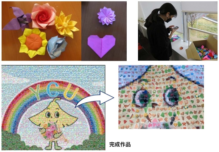 このプロジェクトは、面会制限等により不自由さを感じている患者さんに、折り紙作りをとおして、少しでも楽しい時間を過ごしてもらうことを目的に活動を進めてきました。感染防止のため学生は病棟に立ち入れないため、「折り紙キット」を作成し、SNSを利用して折り方の動画を配信するなど、患者さんにも参加してもらえる工夫を重ねました。病院職員の協力を得て各病棟のデイルームと、金沢八景キャンパスのYCUスクエア1階やシーガルセンター1階学食前に折り紙の配布箱・回収箱を設置し協力を呼び掛けたことで、フォトモザイクアートを作成するのに充分な折り紙を回収することができました。