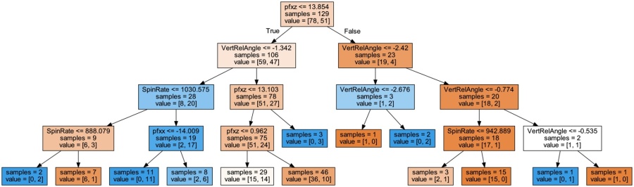 投手の観点では、「フォーク」という球種に着目し「空振りの取れる特徴量」を分析しました。フォークで打者から空振りを奪うには、縦の変化量が大きく、投手がボールを放すときの地面に対する角度を低くすることが重要であることが分析により判明しました。