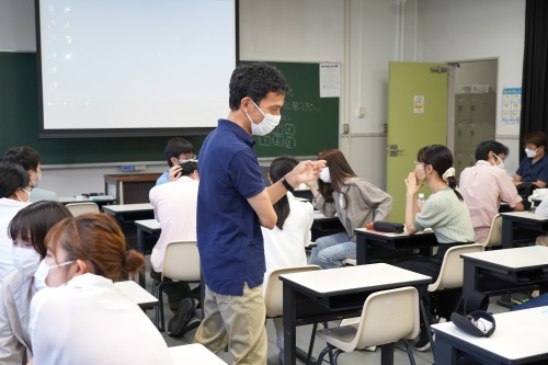 そんな様子を見ていた上田先生が「このクラスのいいところは何だと思う?」と、難題を投げかけます。学生から「分かった!」と即座に声が上がりましたが、上田先生は、学生にすぐには答えさせず、それぞれの班で考えるように指示を出します。