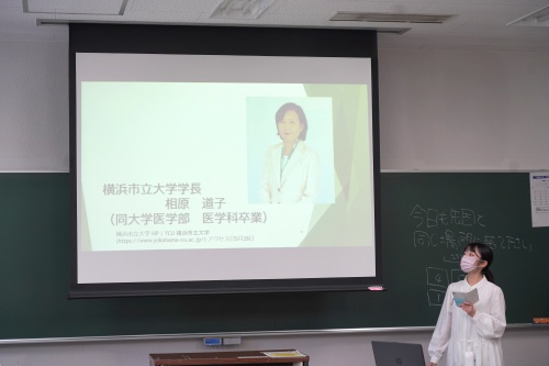 学長へのインタビューから3週間後にグループ発表が行われました。発表を聞いた学生は、医学部についての理解を深めることができ、世界を意識すること、自分がどのように大学で人との交っているのかを改めて考える機会になりました。また、実際に学内を歩いて調べたキャンパスマップの発表では、まだ知らなかった施設などもあり、「横浜市立大学の魅力」を知るきっかけとなりました。