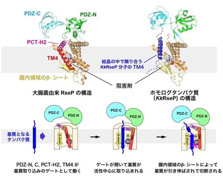 (図)大腸菌由来RsePと海洋性細菌由来のホモログタンパク質(KkRseP)のX線結晶構造解析から推定される基質の取り込みと切断のモデル。 RsePとKkRsePの構造では、PDZ-N、Cドメイン、PCT-H2、TM4の配置が大きく異なり、KkRsePでは結晶の中で隣り合う別のKkRseP分子のTM4が、活性中心の近くに入り込んでいる。RsePが基質となる膜タンパク質を活性中心へと取り込む際にも、PDZ-N、CドメインやPCT-H2、TM4をゲートのように開閉すると考えられる。また、このゲートの開閉の際には、TM4とPCT-H2を繋ぐアスパラギン酸残基(D)が重要な役割を担うと考えられる。亜鉛イオン(Zn)が結合する活性中心に取り込まれた基質は、膜内領域にあるβ-シートに引き伸ばされ、RsePやホモログタンパク質が共通して持っているアスパラギン残基(N)によって固定されて、切断されると推定される。