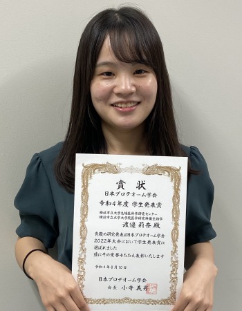 医学部医学科5年の渡邉莉奈さんが、2022年8月8日(月)~8月10日(水)に北里大学 相模原キャンパスにて開催された日本プロテオーム学会2022年大会(JHUPO第20回大会)において、「ヒトグリオーマ悪性形質獲得機構関連因子の探索」について発表し、数多くの演題の中より学生発表賞を受賞しました。
